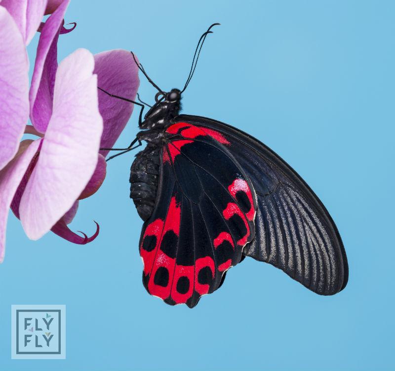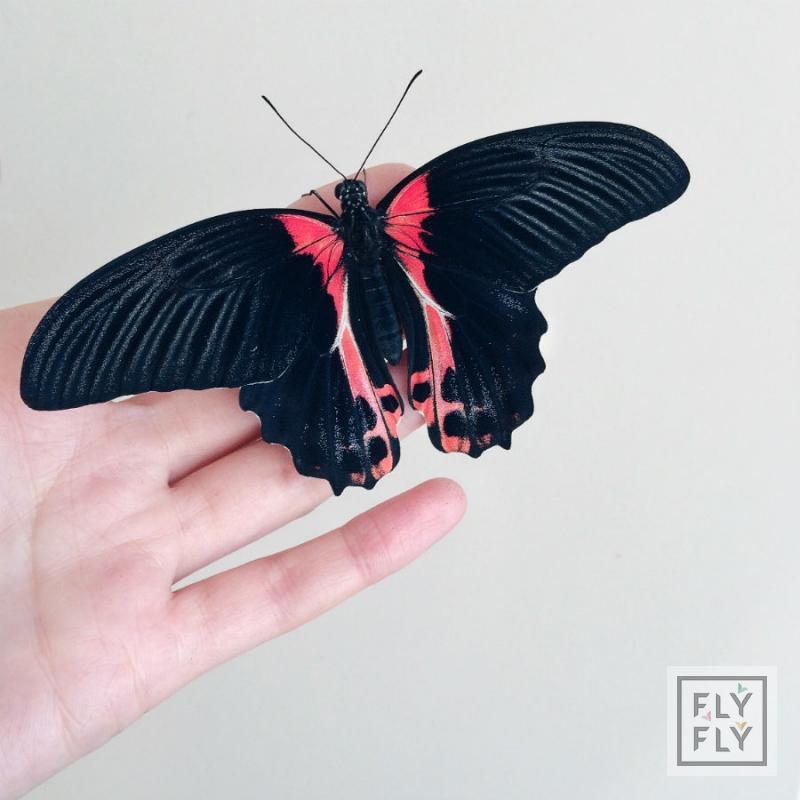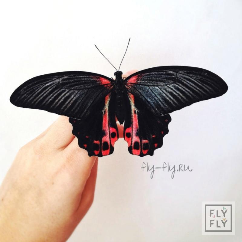 Размах крыльев до 14 см. Очень яркая и крупная бабочка. Основной цвет крыльев - черный, с ярко-красными пятнами у основания крыльев. Срок жизни до двух недель.