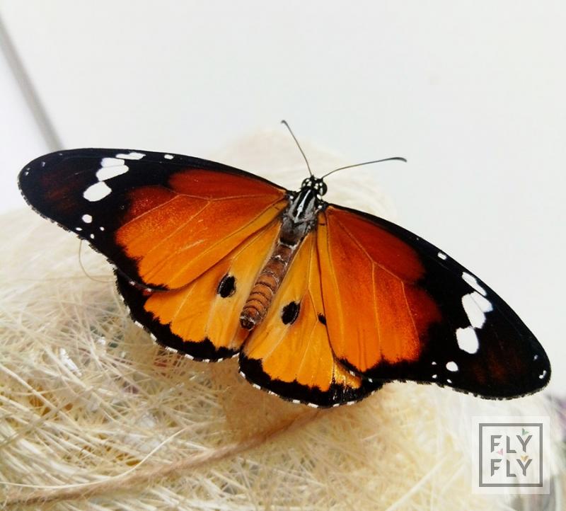 Яркая тропическая бабочка с размахом крыльев до 6 см. Основной цвет крыльев - оранжевый, с черной каймой. Срок жизни до двух недель.